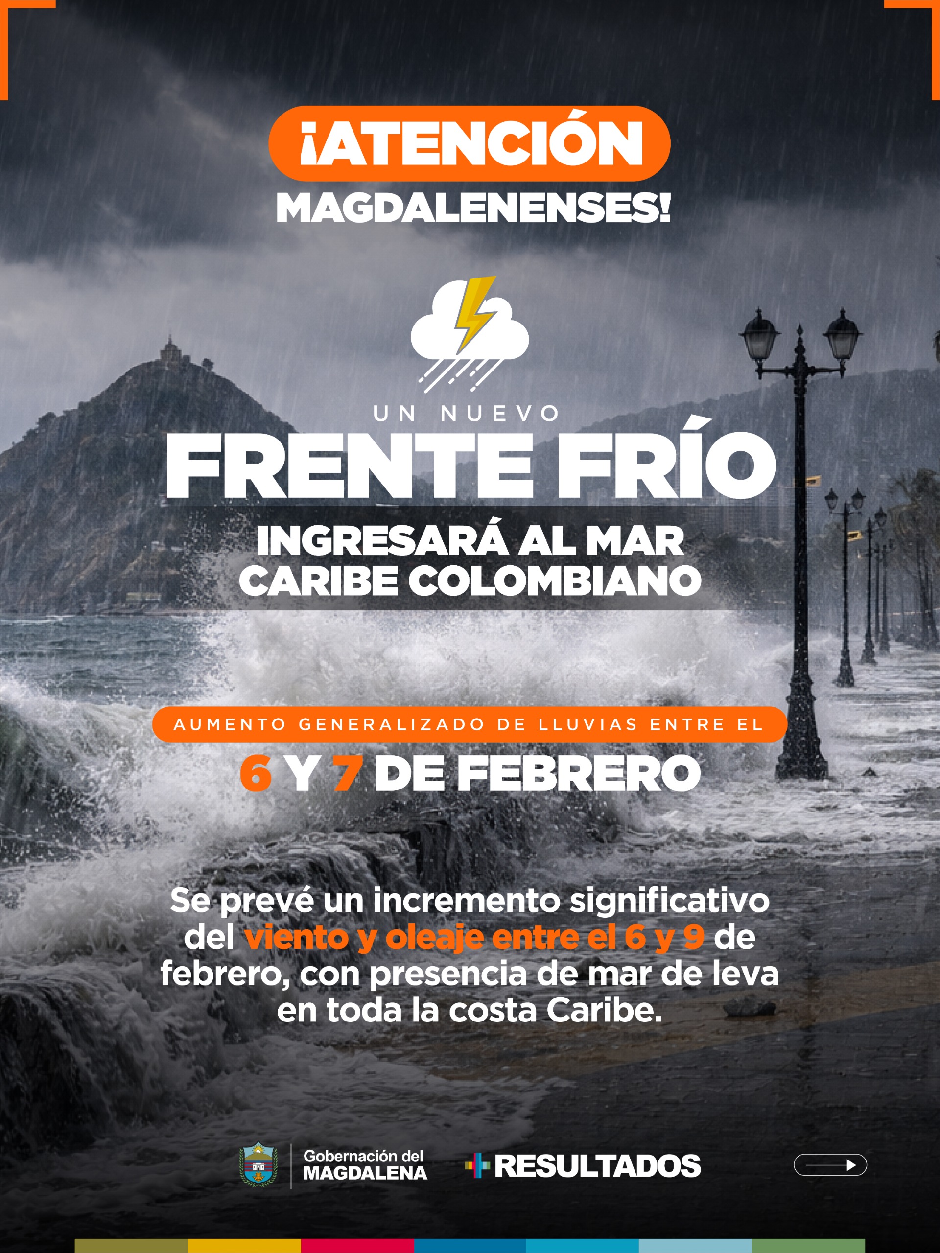La Gobernación del Magdalena hace un llamado a la comunidad del departamento a estar atentos, tomar las medidas de prevención necesarias y acatar oportunamente los llamados de las autoridades ante posibles evacuaciones, teniendo en cuenta la influencia de un nuevo frente frío en el país, del 6 al 9 de febrero.