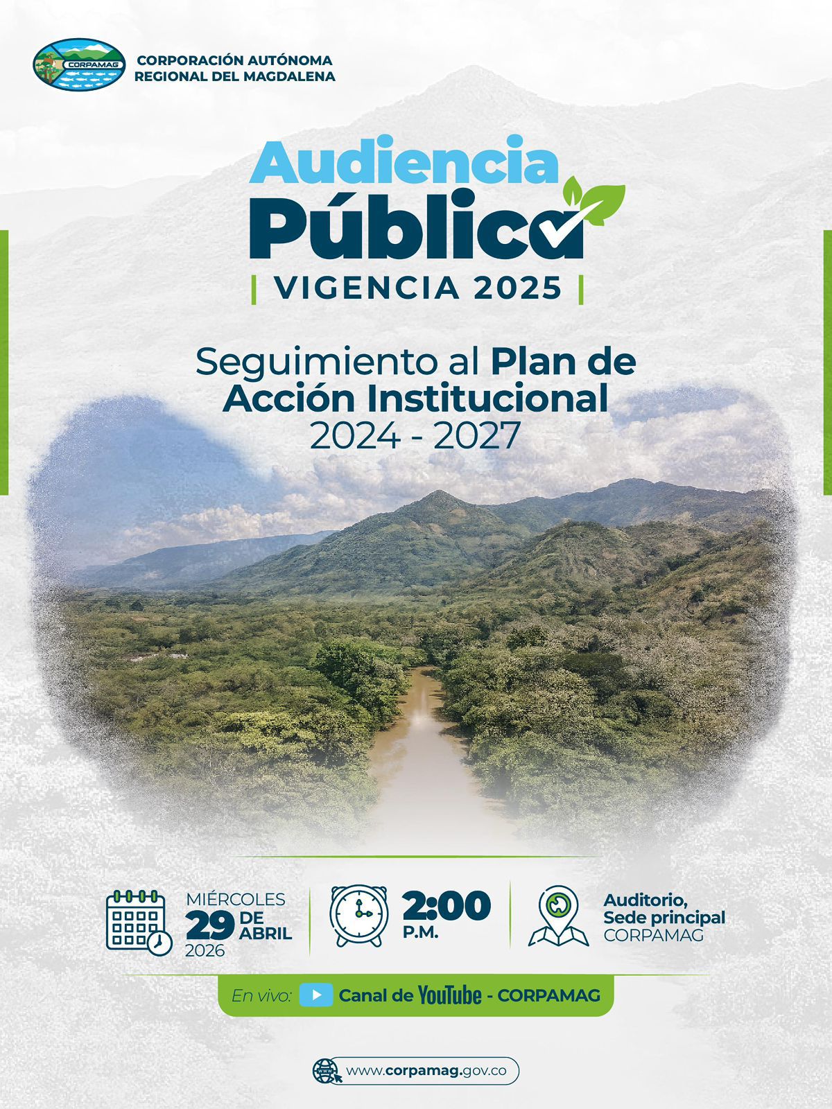 La Corporación Autónoma Regional del Magdalena – CORPAMAG realizará este miércoles 29 de abril la Audiencia Pública de Seguimiento al Plan de Acción Institucional 2024-2027, un espacio de participación y transparencia en el que el director general de la entidad, Alfredo Martínez Gutiérrez, presentará a la ciudadanía los principales avances y resultados de la gestión institucional correspondientes a la vigencia 2025.